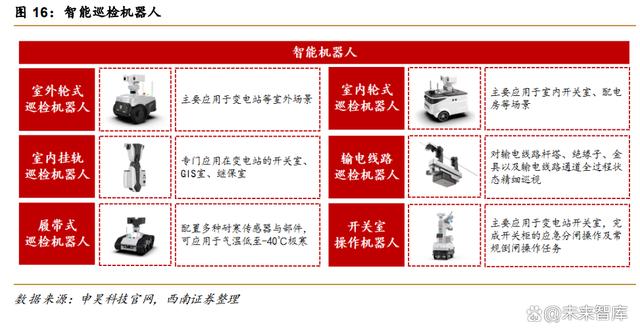 巡檢是保障電網(wǎng)穩(wěn)定性的重要環(huán)節(jié)。巡檢機(jī)器人有多種應(yīng)用場景,可在變電站、輸電網(wǎng) 等場景使用,其中在變電站的應(yīng)用更早,變電站巡檢場景包括室外場景及高壓室、保護(hù)室、 開關(guān)室等室內(nèi)場景。巡檢機(jī)器人可實(shí)現(xiàn)對室內(nèi)外設(shè)備的精準(zhǔn)檢測,并通過后臺(tái)對巡檢數(shù)據(jù)進(jìn) 行比對和分析,實(shí)現(xiàn)預(yù)測性維護(hù),在提高巡檢效率的同時(shí),可有效保障設(shè)備的平穩(wěn)運(yùn)行。此 外,由于輸電通常在溝壑、高山、丘陵等環(huán)境復(fù)雜的區(qū)域,且輸電線路直接暴露于大氣環(huán)境 中,在運(yùn)行中會(huì)誘發(fā)多種事故,人工巡檢和檢修面臨著線路長、工作強(qiáng)度大、條件艱苦、效率低下、檢測質(zhì)量不佳等一系列問題,無法獲得輸電線路的實(shí)時(shí)運(yùn)行情況,甚至威脅作業(yè)人 員的生命安全,通過輸電線路巡檢機(jī)器人可實(shí)現(xiàn)對輸電線路桿塔、絕緣子以及輸電線路通道 等精確巡視,自動(dòng)采集數(shù)據(jù)并進(jìn)行后臺(tái)分析,為輸電線路的運(yùn)維提供可靠的信息。