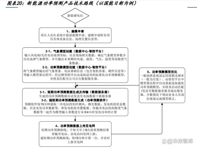 新能源功率產(chǎn)品每日工作流程(以國能日新產(chǎn)品為例):①獲得原始氣象預報數(shù)據(jù)、②通 過建模計算后得到更高精度的氣象預測數(shù)據(jù)、③進行短期功率預測數(shù)據(jù)計算、④傳輸短期 功率數(shù)據(jù)到所服務電站、⑤在電站軟件中進行超短功率預測、⑥報送數(shù)據(jù)至電網(wǎng)調(diào)度部門。