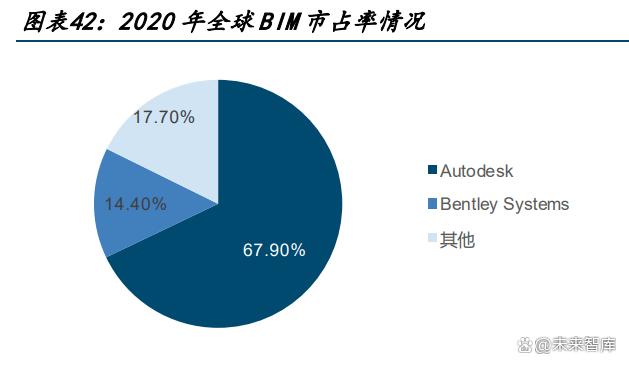 信創(chuàng)發(fā)展背景下,BIM 行業(yè)國產(chǎn)化替代需求強烈。信息技術(shù)應(yīng)用創(chuàng)新為近年以來我國關(guān)鍵 命題,旨在通過對 IT 硬件、軟件的重構(gòu),建立我國自主可控的 IT 產(chǎn)業(yè)標準和生態(tài),逐步 實現(xiàn)各環(huán)節(jié)國產(chǎn)替代。國內(nèi)使用的 BIM 平臺主要為國外軟件,而國內(nèi)廠商主要以項目管理 和單點應(yīng)用類型的產(chǎn)品為主,底層核心技術(shù)大多掌握在國外廠商手中。2020 年全球 BIM 行業(yè)市場中,Autodesk 市占率為 67.9%,其次 Bentley Systems 市占率為 14.37%,CR2 集中度較高,顯示出國產(chǎn)替代的必要性和緊迫性。