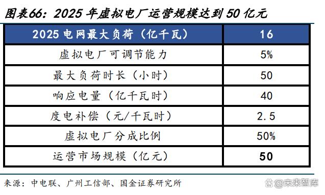 預計 2025 年虛擬電廠投資規(guī)模達到 800 億元,運營市場規(guī)模達到 50 億元?,F(xiàn)階段主要 的盈利模式為通過需求側(cè)響應(yīng)賺取輔助服務(wù)費用后的分成。據(jù)中電聯(lián)預計,2025 年我國 全社會用電量將達 9.5 萬億千瓦時,而最大負荷將達到 16 億千瓦,按 5%可調(diào)節(jié)能力、投 資成本 1000 元/千瓦計算,預計到 2025 年,虛擬電廠投資規(guī)模有望達 800 億元。參考目 前峰值負荷時長水平,我們預計 2025 峰值負荷將達到 50 小時,對應(yīng) 2025 年電網(wǎng)需求側(cè) 響應(yīng)電量 40 億千瓦時。目前我國虛擬電廠處于發(fā)展初期,度電補償較高以刺激時長,參 考《廣州市虛擬電廠實施細則》0-5 元/千瓦時的削峰響應(yīng)補貼,預計 2025 年虛擬電廠進 入商業(yè)化運營后,補償標準為 2.5 元/千瓦時。假設(shè)分成比例為 50%,則預計 2025 年虛擬 電廠運營市場規(guī)模將達到 50 億元。