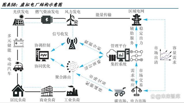 虛擬電廠本質(zhì)上是一套軟件平臺系統(tǒng),核心為“通信”和“聚合”。通過先進信息通信技 術(shù)和軟件系統(tǒng),實現(xiàn)分布式電源、儲能系統(tǒng)、可控負荷、電動汽車等分布式能源資源的聚 合和協(xié)調(diào)優(yōu)化,以作為一個特殊電廠參與電力市場和電網(wǎng)運行的電源協(xié)調(diào)管理系統(tǒng),為配 電網(wǎng)和輸電網(wǎng)提供管理和輔助服務(wù)。虛擬電廠概念的核心可以總結(jié)為“通信”和“聚合”, 關(guān)鍵技術(shù)主要包括協(xié)調(diào)控制技術(shù)、智能計量技術(shù)以及信息通信技術(shù)。 虛擬電廠分為兩類:“負荷類”虛擬電廠,和“源網(wǎng)荷儲一體化”虛擬電廠。1)“負荷類” : 聚合了具備調(diào)節(jié)能力的電動汽車、充電樁等市場化用戶,作為一個整體,對外提供負荷側(cè) 靈活性相應(yīng)調(diào)節(jié)服務(wù)。2)“源網(wǎng)荷儲一體化”:聚合新能源發(fā)電、用戶及配儲一系列環(huán)節(jié), 作為獨立市場主體參與電力市場、具備自主調(diào)峰調(diào)節(jié)能力。 具備“源-荷”雙重身份,有效實現(xiàn)削峰填谷。虛擬電廠把各類可調(diào)負荷資源匯聚,根據(jù) 電網(wǎng)削峰填谷的需求,進行線上填報,計劃下發(fā),執(zhí)行反饋,類似于線上工單派單系統(tǒng)。 電網(wǎng)給調(diào)度指令計劃,需求響應(yīng)調(diào)控計劃,提前幾天/幾周把計劃發(fā)下來。負荷集成商, 虛擬電廠運營商,會把計劃告訴客戶,哪些時段把負荷停掉,把用電負荷降下來,具有源 -荷雙重身份。