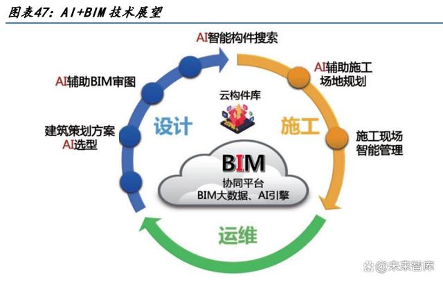 BIM 與人工智能深度融合,有望在設(shè)計、施工、運維階段開拓應(yīng)用場景與解決方案。 設(shè)計階段:1)構(gòu)件智能搜索:可以在構(gòu)件智能搜索中使用人工智能對構(gòu)件進行準確 的自動分類,以及使用自然語言理解技術(shù)實現(xiàn)構(gòu)件屬性的智能校準;2)AI 輔助布局 規(guī)劃:融入最新的機器學習技術(shù),可以在瀏覽器上生成建筑策劃文件,并輸出建筑空 間的最優(yōu)化布局;3)AI 輔助 BIM 審圖:AI 技術(shù)可以輔助 BIM 對大量規(guī)范、圖集、標 準以及模型、圖紙的匹配性學習,做好設(shè)計合規(guī)性、合理性的把控。施工階段:進行輔助施工場地規(guī)劃,AI 可以通過場地智能布置和合規(guī)合理性校驗來 幫助經(jīng)驗不足的技術(shù)人員增質(zhì)提效,通過建模對施工現(xiàn)場不同階段的復雜狀態(tài)進行模 擬展示,通過數(shù)據(jù)分析及時反饋前期方案的合理性,同時反向指導施工組織設(shè)計,進 行資源配置優(yōu)化。 運維階段:進行運維智能管理,AI 可以通過機器人和無人機等的應(yīng)用,使用大量實 際現(xiàn)場視頻數(shù)據(jù)進行訓練,對現(xiàn)場數(shù)據(jù)進行分類處理和智能管理,大幅提升施工效率 和安全質(zhì)量水準。