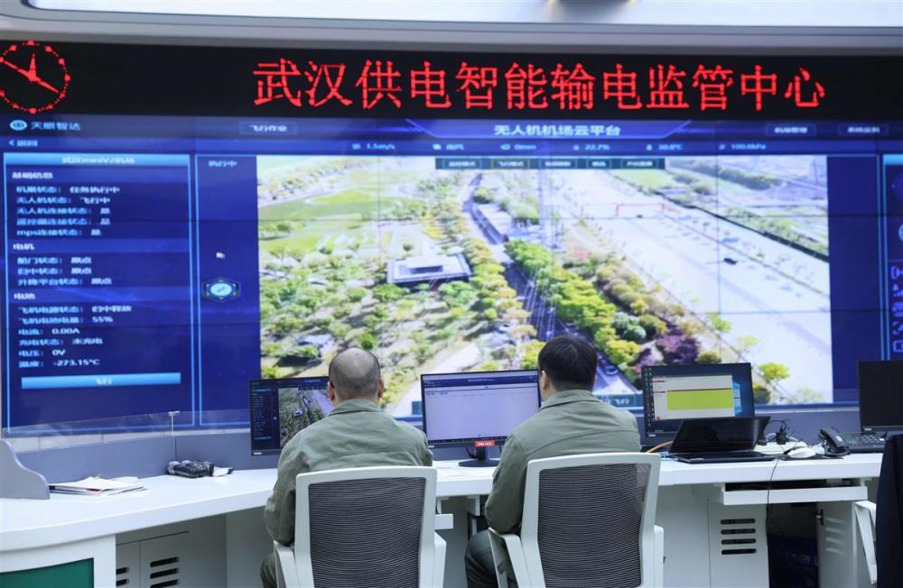 10月23日,武漢漢口江灘,一架白色的無人機(jī)在高空穿梭,機(jī)頭對(duì)準(zhǔn)濱江區(qū)內(nèi)的國(guó)家電網(wǎng)線路來回進(jìn)行掃描、拍攝。與此同時(shí),距離巡檢現(xiàn)場(chǎng)數(shù)公里外的國(guó)網(wǎng)武漢供電公司的巨型屏幕上,無人機(jī)的超高清畫面即時(shí)顯示。