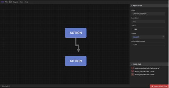 2.攻擊鏈建模編輯器:在瀏覽器中運(yùn)行,幾分鐘內(nèi)便可完成攻擊流程的創(chuàng)建。該編輯器提供了一個工作空間,用戶可以輸入攻擊行動及其他背景信息,通過繪制箭頭,用戶可將這些信息編織成一個攻擊流程,明確展示事件或活動中觀察到的攻擊技術(shù)執(zhí)行順序。
