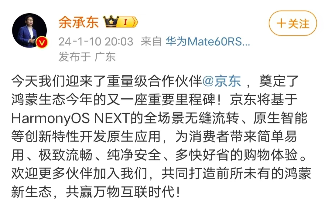 華為常務董事、終端業(yè)務CEO、智能汽車解決方案BU董事長余承東在微博發(fā)文稱:“今天我們迎來了重量級合作伙伴京東,奠定了鴻蒙生態(tài)今年的又一座重要里程碑!