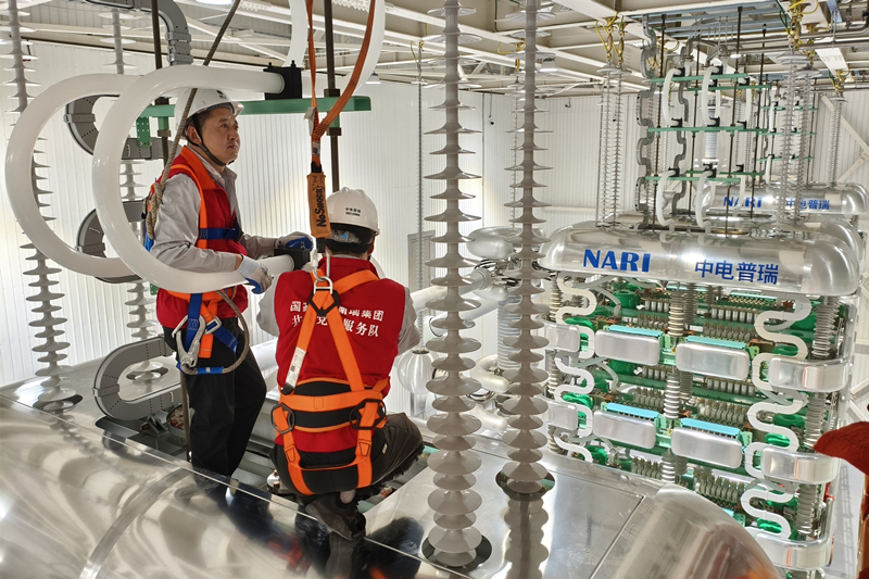 ▲國網(wǎng)電科院(南瑞集團(tuán))員工在渝北換流站開展雙極低端換流閥帶電前專項檢查