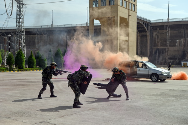 此次演練模擬恐怖分子挾持施工單位車輛,偽裝成施工人員在上班高峰期混入生產(chǎn)區(qū)域,并攜帶爆炸物意圖對(duì)大壩、330千伏開關(guān)站等重點(diǎn)部位實(shí)施爆炸破壞,在尋找時(shí)機(jī)實(shí)施破壞活動(dòng)時(shí)被該廠測(cè)溫人員發(fā)現(xiàn),在上前詢問(wèn)、檢查證件時(shí)恐怖分子身份暴露,隨后挾持測(cè)溫人員,強(qiáng)行進(jìn)行爆炸破壞活動(dòng),最終被駐廠武警戰(zhàn)士和縣公安局防爆警察制服并成功解救被挾持人質(zhì)為場(chǎng)景。