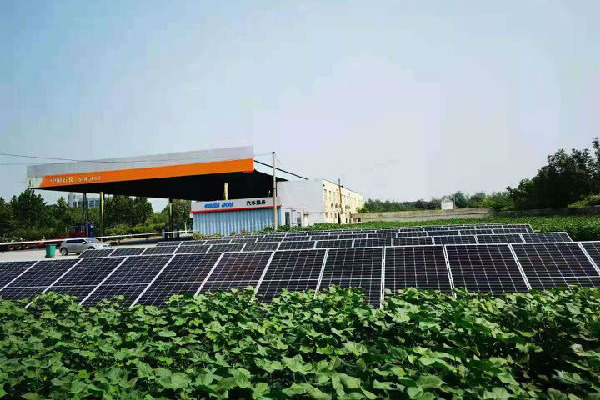 該分布式光伏電站位于夏津縣高速入口處第11號加油站,為德州公司智能公司與中國石化德州公司洽談合作的第一個加油站分布式光伏發(fā)電項目,也是德州第一個“綠色”加油站示范項目。此項目采用地面安裝的方式,充分利用了加油站的空閑土地。分布式光伏電站裝機容量30千瓦,共布置67塊450瓦單晶硅光伏組件,平均年發(fā)電量3.5萬度,所發(fā)電量全部就地消納,每月節(jié)省電費約3千元,投資回收周期僅需4年。預計間接減排二氧化碳28.3噸,相當于植樹近1.5萬棵的環(huán)保效應。項目投產(chǎn)后,第11號加油站在白天可通過光伏發(fā)電滿足自身部分用電需求,同時還可將盈余電量并入電網(wǎng),極大提高了新型能源的使用效率。