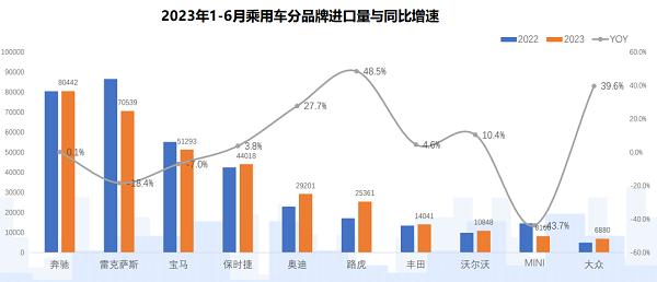 今年上半年,進(jìn)口車前十品牌中,奔馳、保時捷、奧迪、路虎、豐田、沃爾沃、大眾等七個品牌實(shí)現(xiàn)正增長;其中,奔馳同比上升0.1%至80442輛,排名第一。而寶馬和MINI,則由于車型國產(chǎn)導(dǎo)致銷量分別下滑7%和43.7%;雷克薩斯也因?yàn)橹髁囆虴S系列銷量疲軟下滑了18.4%。