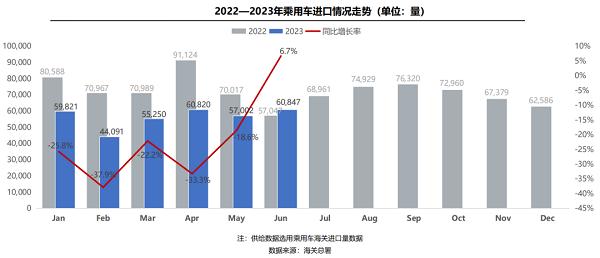 今年6月,我國乘用車進(jìn)口6.1萬輛(含底盤),同比增長6.7%;1-6月累計進(jìn)口33.8萬輛,同比下滑23.3%,主要原因?yàn)閲鴥?nèi)市場消費(fèi)結(jié)構(gòu)改變及電動化轉(zhuǎn)型降低了對燃油車的需求。銷量方面,6月,進(jìn)口乘用車終端銷售6.5萬輛,同比下滑9.1%,環(huán)比增長6.6%。1-6月,進(jìn)口乘用車?yán)塾嬩N售36.5萬輛,同比微降0.6%;相比之下,新能源進(jìn)口車銷量同比漲幅接近七成。