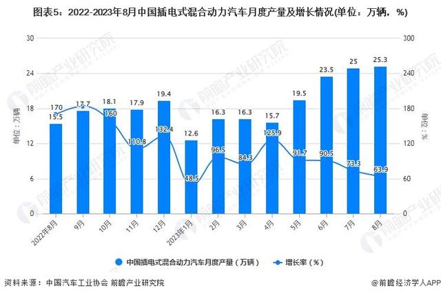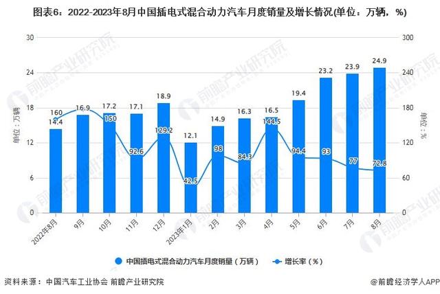 據(jù)中國汽車工業(yè)協(xié)會統(tǒng)計數(shù)據(jù)顯示,2022年全年月中國插電式混合動力汽車產(chǎn)銷累計分別完成158.8萬輛和151.8萬輛,累計分別增長164.1%和151.6%。截至2023年8月中國插電式混合動力汽車產(chǎn)銷分別完成25.3萬輛和24.9萬輛,同比分別增長63.9%和72.8%。
