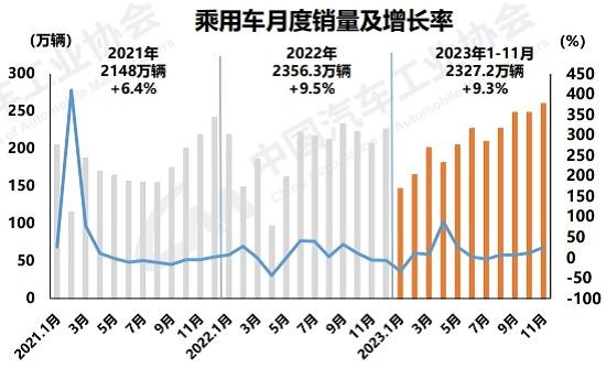 綜合1-11月,乘用車產銷分別完成2344.1萬輛和2327.2萬輛,同比分別增長8%和9.3%。其中,乘用車國內銷量為1955.2萬輛,同比增長2.7%;出口372萬輛,同比增長65.1%。