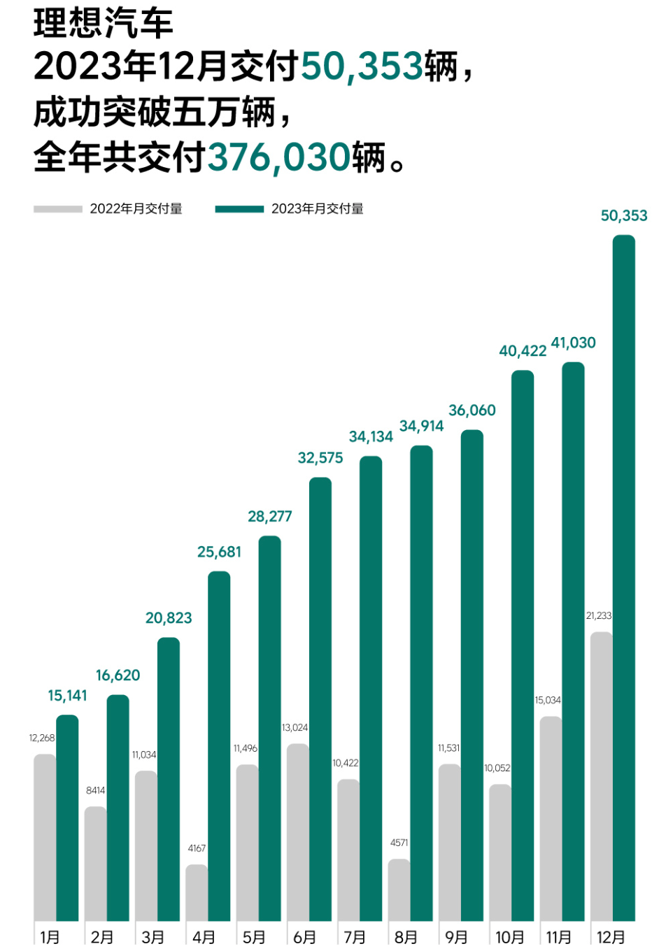 作為新勢力的代表,理想汽車今年表現(xiàn)也同樣亮眼。其公布的數(shù)據(jù)顯示,2023年12月,理想汽車交付新車5.04萬輛,同比增長137.1%。這也是理想汽車首次月交付超過5萬大關,兌現(xiàn)了CEO李想此前的承諾。整體來看,理想在2023年累計交付37.6萬輛,同比增長182.2%。截至2023年12月31日,理想汽車累計交付量超60萬輛,是交付量最高的新勢力車企。