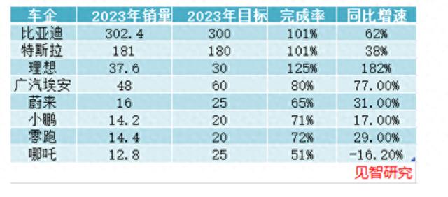 2023年中國(guó)新能源汽車市場(chǎng)競(jìng)爭(zhēng)激烈,頭部車企普遍完成年度銷量目標(biāo),但其他新勢(shì)力車企表現(xiàn)不佳,與頭部車企的增速相比普遍偏低,部分甚至出現(xiàn)負(fù)增長(zhǎng)。