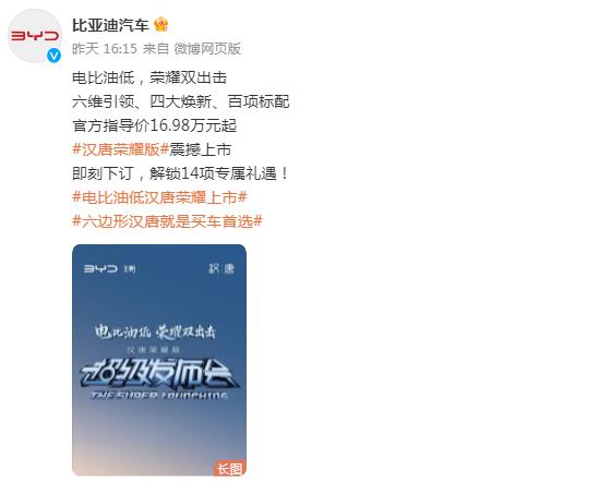 而在2月28日,比亞迪漢唐榮耀版車型正式上市,官方指導(dǎo)價16.98萬元起。具體來看,漢EV榮耀版共4款車型,售價17.98萬—24.98萬元;漢DM-i榮耀版共5款車型,售價16.98萬—22.58萬元;2024款漢DM-p戰(zhàn)神版共1款車型,售價25.98萬元;唐DM-i榮耀版共4款車型,售價17.98萬—21.98萬元。