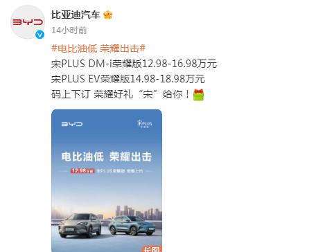 2月29日,比亞迪再出“王炸”。當(dāng)天,比亞迪汽車發(fā)布微博稱,宋PLUS DM-i榮耀版12.98萬—16.98萬元;宋PLUS EV榮耀版14.98萬—18.98萬元。同時,比亞迪還推出B級轎車“新王炸”——海豹DM-i榮耀版勁爆上市,14.98萬元起。