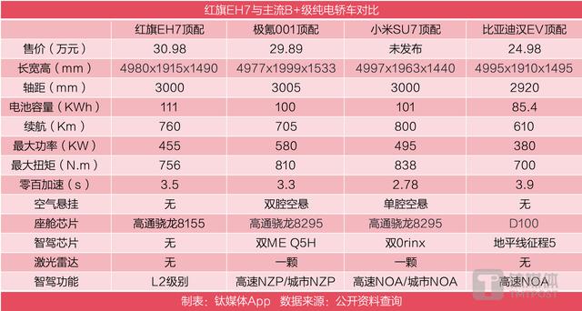 三電方面,紅旗為EH7配備了一塊111度的超大電池,電池容量是同級車型中的最大,這讓EH7的續(xù)航能力位居前列,CLTC續(xù)航達到760公里;EH7四驅(qū)版的動力性能與極氪001和小米SU7不相上下,值得指出的是,紅旗表示EH7的電機最高轉(zhuǎn)速達到22500轉(zhuǎn)/分鐘,是量產(chǎn)車型中的行業(yè)第一,此前小米在SU7的技術發(fā)布會上也有過類似表述。EH7的零百加速也達到了3秒級,為3.5秒,不及極氪001和小米SU7的3.3秒和2.78秒,但好于比亞迪漢EV的3.9秒。