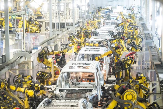 4月1日,在位于湖北武漢經(jīng)開(kāi)區(qū)的嵐圖汽車電動(dòng)化焊裝車間,機(jī)器人在流水線上作業(yè)。新華社記者肖藝九攝
