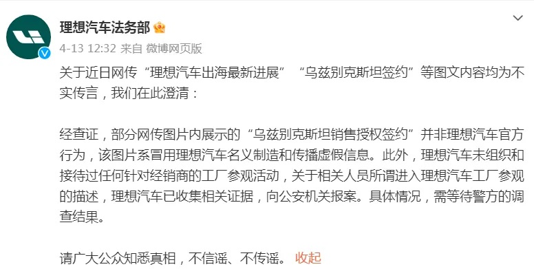 此外,@理想汽車法務部 日前發(fā)文稱,關于近日網傳“理想汽車出海最新進展”“烏茲別克斯坦簽約”等圖文內容均為不實傳言。