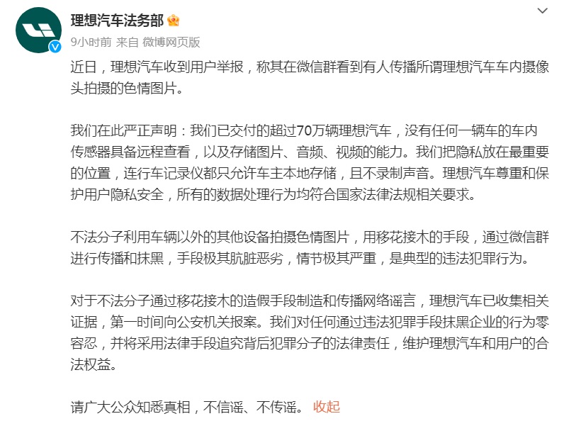 4月15日,@理想汽車法務部 發(fā)文稱,近日收到用戶舉報,稱其在微信群看到有人傳播所謂理想汽車車內攝像頭拍攝的色情圖片。