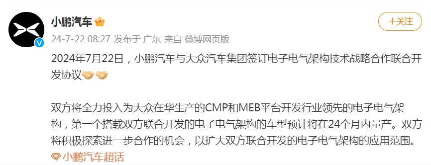 根據(jù)小鵬汽車公告,在上述合作中,小鵬汽車與大眾汽車集團(tuán)在廣州和合肥建立了聯(lián)合開發(fā)項(xiàng)目組。