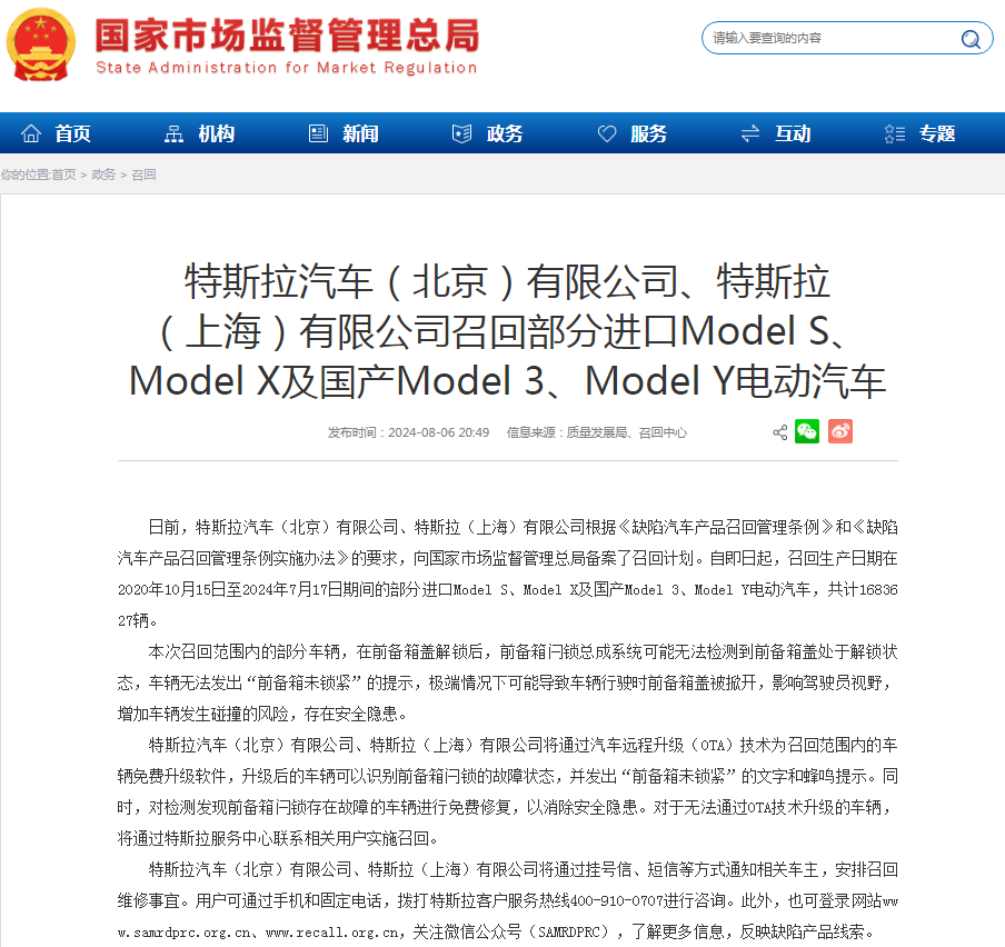 據(jù)市場(chǎng)監(jiān)管總局6日消息,特斯拉汽車(北京)有限公司、特斯拉(上海)有限公司根據(jù)《缺陷汽車產(chǎn)品召回管理?xiàng)l例》和《缺陷汽車產(chǎn)品召回管理?xiàng)l例實(shí)施辦法》的要求,近日向市場(chǎng)監(jiān)管總局備案了召回計(jì)劃:自即日起,召回生產(chǎn)日期在2020年10月15日至2024年7月17日期間的部分進(jìn)口Model S、Model X及國(guó)產(chǎn)Model 3、Model Y電動(dòng)汽車,共計(jì)1683627輛。