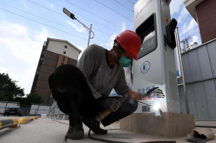8月15日,在湖畔嘉苑麗景苑東北角停車場新能源汽車充電樁城市基礎配套設施停車場,施工人員正對45個充電樁進行最后的安裝調(diào)試。