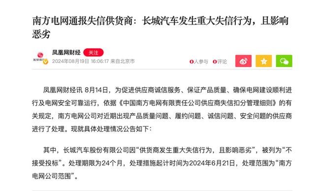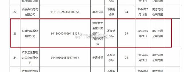 其中,長城汽車股份有限公司因“供貨商發(fā)生重大失信行為,且影響惡劣”,被列為“不接受投標(biāo)”。處理期限為24個月,處理措施起計(jì)時間為2024年6月21日,處理范圍為“南方電網(wǎng)公司范圍”。
