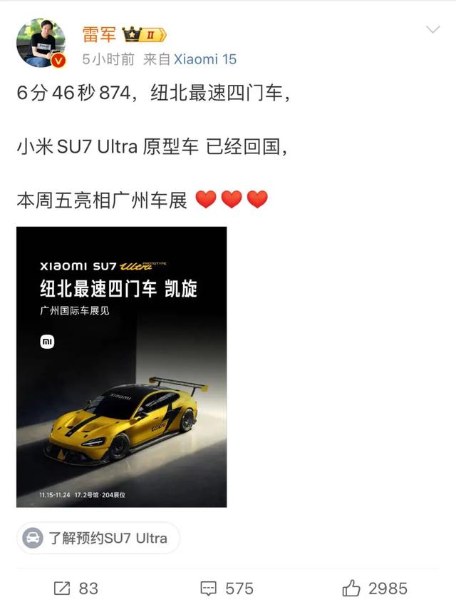 11月12日,雷軍在微博高調(diào)宣布:“小米SU7 Ultra原型車已經(jīng)回國,并將于廣州車展上正式亮相。”據(jù)了解,該車定位為巔峰性能科技轎車,定價(jià)為81.49萬元。然而,即便如此,在預(yù)訂開啟僅10分鐘內(nèi),小訂量就突破了3680臺(tái)。