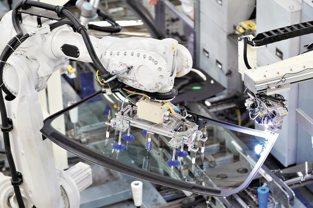 前后擋風(fēng)玻璃安裝站是一個多機器人融合的工位。