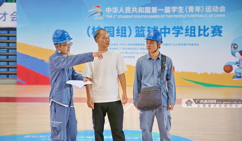 玉林供電局用電檢查人員同比賽場(chǎng)館配電房負(fù)責(zé)人交代用電注意事項(xiàng),確保比賽期間供電穩(wěn)定可靠。佘晟 攝