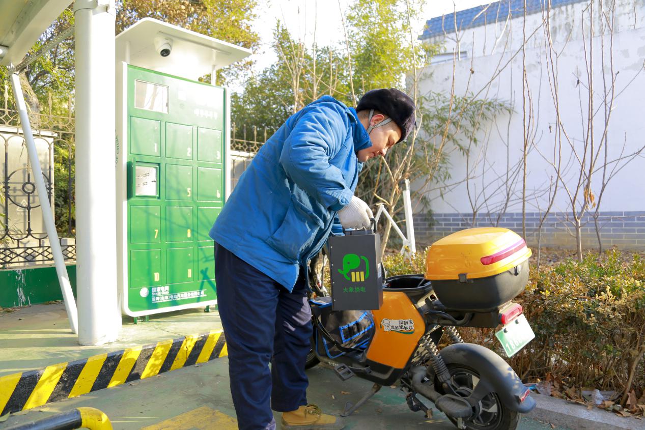 國(guó)網(wǎng)棗莊供電公司常莊供電所員工為現(xiàn)場(chǎng)檢修騎乘的“大象換電”自行車更換電池。(賈方寧 攝)