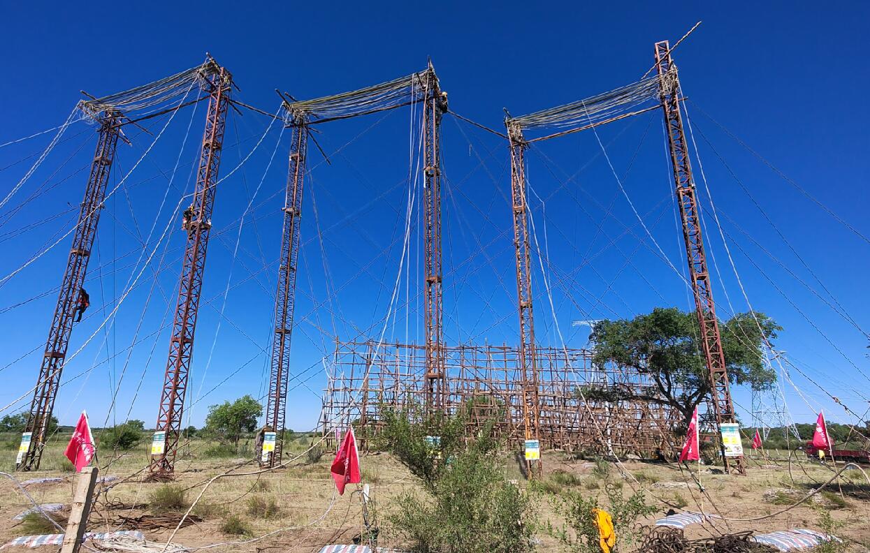 在跨越點(diǎn)位置,兩條單回路走向與桑錫鐵路的交叉角度分別為62°、63°,交叉角度大,施工相對(duì)困難。項(xiàng)目部根據(jù)現(xiàn)場(chǎng)實(shí)地勘察,并結(jié)合以往跨越鐵路施工經(jīng)驗(yàn),采用了“在桑錫鐵路網(wǎng)圍欄兩側(cè)搭設(shè)獨(dú)立抱桿跨越架,在跨越架之間用絕緣桿封網(wǎng)”的方式進(jìn)行跨越施工。為保障跨越施工順利完成,送變電公司配備精兵強(qiáng)將,項(xiàng)目部提早完成跨越手續(xù)辦理。班組負(fù)責(zé)人、防護(hù)員、安全員、技術(shù)員、駐站聯(lián)絡(luò)員等全程到崗到位。經(jīng)過(guò)13天精心準(zhǔn)備,牽張場(chǎng)地布置、跨越架和防護(hù)架搭設(shè)、各種工器具和導(dǎo)地線及光纜進(jìn)場(chǎng)等各項(xiàng)準(zhǔn)備工作全部就緒。