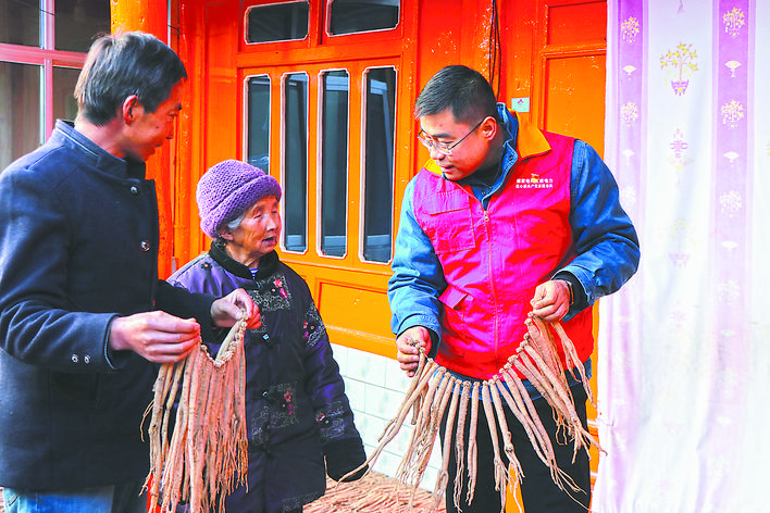 郝廣平(右)到貧困戶家里了解中藥材收成情況。