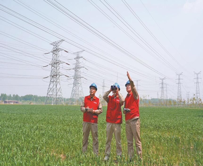 國家電網(wǎng)天津電力心連心(送變電)共產(chǎn)黨員服務隊隊員在第七屆世界智能大會期間巡檢輸電線路。