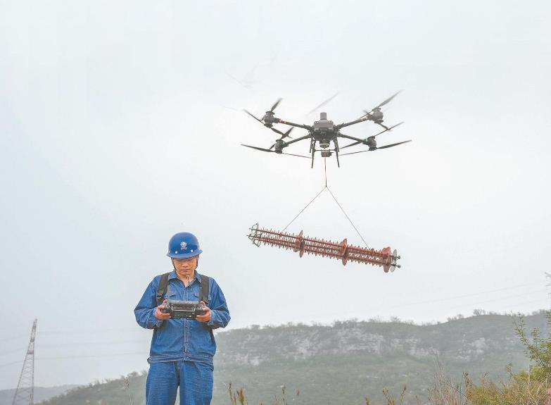柔性攻關(guān)創(chuàng)新團(tuán)隊成員應(yīng)用改造后的重載無人機(jī)將合成絕緣子串送至220千伏梁柏Ⅰ線檢修現(xiàn)場。