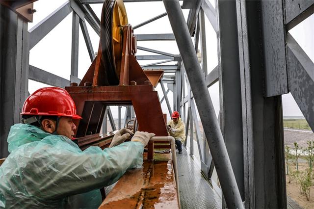 國網(wǎng)江蘇南通供電公司員工冒雨檢查閘口用電設(shè)備,確保安全運行。