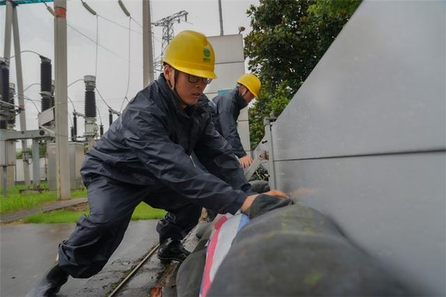 國網(wǎng)安徽安慶岳西縣供電公司員工裝沙袋加固城西變電站圍墻,防范臺風影響變電站設(shè)備安全運行。