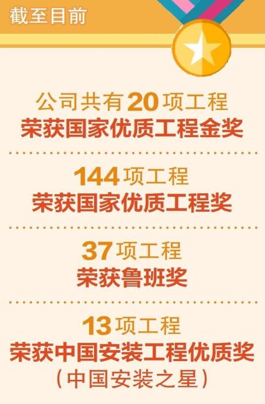 截至目前,公司共有20項(xiàng)工程榮獲國(guó)家優(yōu)質(zhì)工程金獎(jiǎng),144項(xiàng)工程榮獲國(guó)家優(yōu)質(zhì)工程獎(jiǎng),37項(xiàng)工程榮獲魯班獎(jiǎng),13項(xiàng)工程榮獲中國(guó)安裝工程優(yōu)質(zhì)獎(jiǎng)(中國(guó)安裝之星),在電力行業(yè)始終保持第一,在我國(guó)工程建設(shè)領(lǐng)域處于領(lǐng)先地位。