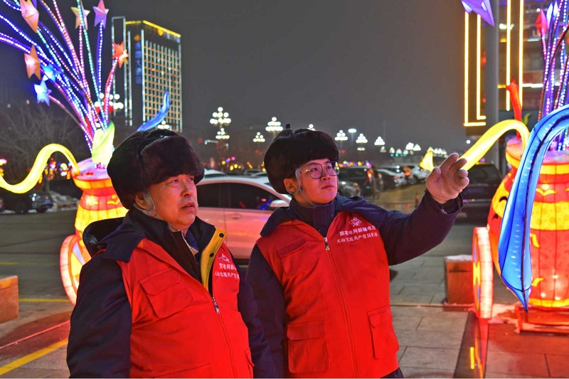 國網(wǎng)新疆奎屯供電公司員工對烏蘇市九蓮泉廣場花燈用電情況進(jìn)行檢查。