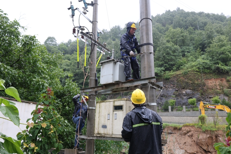 國網(wǎng)陜西商洛柞水縣供電公司員工冒雨搶修營湖小區(qū)臺(tái)區(qū)。