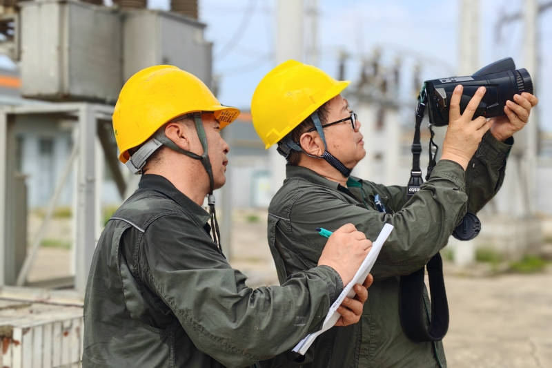國網(wǎng)河北邢臺(tái)供電公司員工在35千伏華龍站進(jìn)行巡檢測(cè)溫。