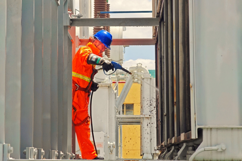 國網(wǎng)山西陽泉供電公司員工帶電水沖洗220千伏溫池變電站1號(hào)主變散熱器。
