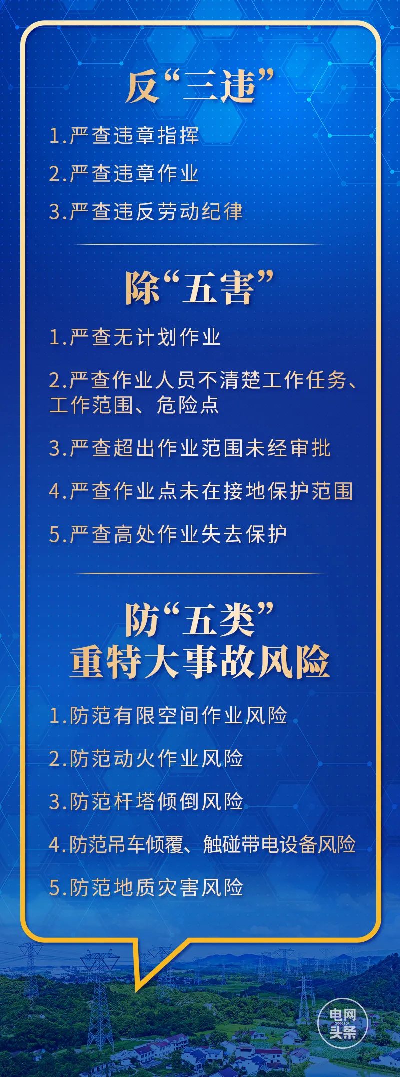 當(dāng)前,國(guó)家電網(wǎng)公司秋季檢修預(yù)試和電網(wǎng)建設(shè)工作即將進(jìn)入高峰期。為認(rèn)真貫徹公司2024年安全生產(chǎn)工作意見(jiàn),落實(shí)公司《關(guān)于開(kāi)展電力安全生產(chǎn)反“三違”專(zhuān)項(xiàng)行動(dòng)的通知》要求,嚴(yán)格秋季作業(yè)安全管控,守牢人身安全紅線(xiàn),國(guó)家電網(wǎng)公司自9月至12月開(kāi)展秋季作業(yè)“反三違、除五害”活動(dòng)。