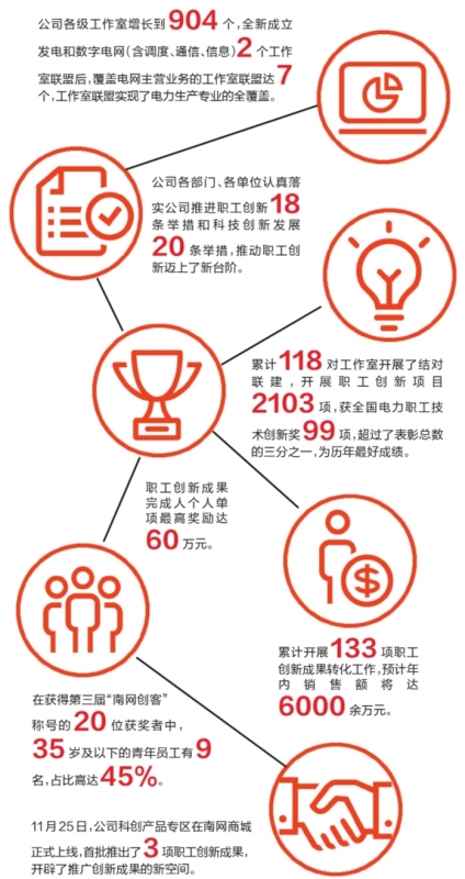 2019年,南方電網公司各部門、各單位認真落實公司推進職工創(chuàng)新的18條舉措和科技創(chuàng)新發(fā)展20條舉措,以工作室聯(lián)盟為抓手,進一步整合全網職工創(chuàng)新力量,打造了更廣闊的創(chuàng)新協(xié)作平臺,為職工創(chuàng)新創(chuàng)造更好的條件;通過建章立制、搭建平臺,打通了創(chuàng)新成果轉化的“最后一公里”;通過開展培訓、經驗交流、成果展覽,使優(yōu)秀成果及創(chuàng)新經驗實現(xiàn)了共享。今年,公司在職創(chuàng)實施、項目獲獎、成果轉化等方面,創(chuàng)造了南網職創(chuàng)新高度。