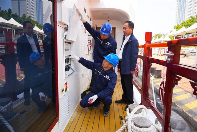 為確保首航成功,當天國網(wǎng)福州供電公司臺江政企服務班的工作人員提前到達現(xiàn)場對游輪的岸電系統(tǒng)進行義務檢查,確保其可靠運行。