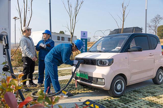 國網(wǎng)馬鞍山供電公司員工在和縣善厚鎮(zhèn)半月湖電動汽車充電站為車主解答充電疑問。高孫浩攝
