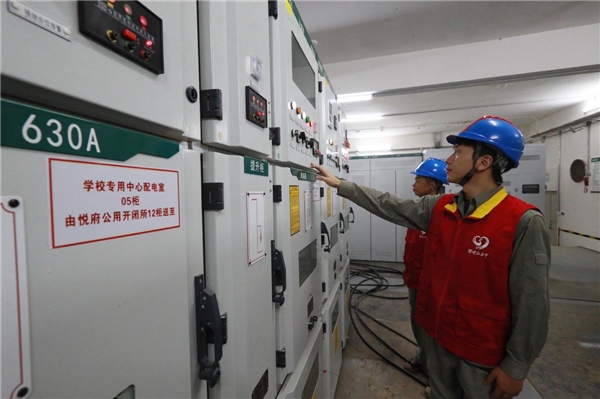 與此同時,在黃陂區(qū)第一中學(xué),服務(wù)隊員仔細(xì)查看了校園內(nèi)的用電設(shè)備使用情況。由于暑假期間學(xué)校的電氣設(shè)備大多處于閑置無負(fù)荷狀態(tài),加之夏季高溫、暴雨等多種因素影響,開學(xué)后校園用電負(fù)荷將大幅增長,容易導(dǎo)致用電設(shè)備出現(xiàn)短路、漏電等安全隱患。服務(wù)隊員根據(jù)學(xué)校的實際情況,逐一檢查校內(nèi)配電室的高低壓柜、變壓器、備用電源以及教學(xué)樓、食堂等處的用電線路及用電設(shè)備,對學(xué)校內(nèi)部線路絕緣老化、進(jìn)出線連接不規(guī)范、開關(guān)接觸不良等問題及時處理,積極配合校方進(jìn)行整改,確保學(xué)校用電設(shè)備在開學(xué)之前全部正常運轉(zhuǎn)。“根據(jù)咱們學(xué)校的用電負(fù)荷特點,我們優(yōu)化了供電線路的布局,也合理調(diào)整了變壓器的運行檔位,制定了詳細(xì)的專項保供電方案,并與學(xué)校建立聯(lián)動機(jī)制,確保開學(xué)時的正常供電。”服務(wù)隊員一邊進(jìn)行安全用電檢查,一邊對學(xué)校后勤相關(guān)負(fù)責(zé)人說道。