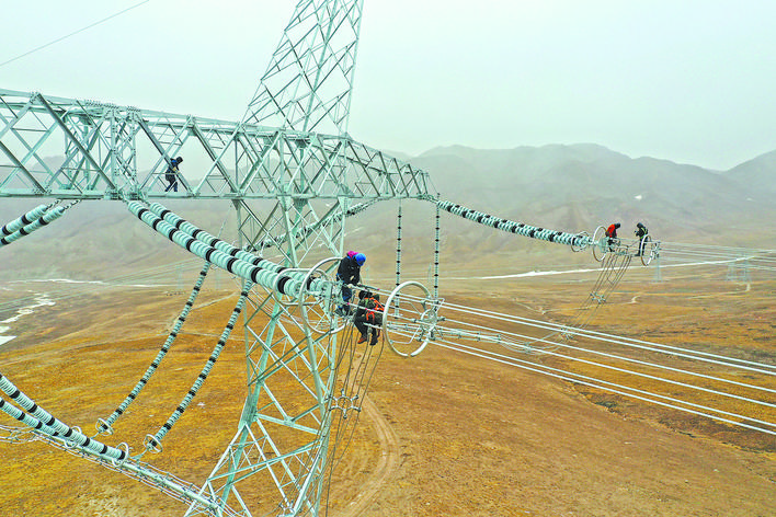 青海省海南藏族自治州,在海拔4000米的拉脊山上,座座鐵塔架起條條銀線。1月24日,在距離地面四五十米的電力線路上,幾個(gè)小小的身影迎著寒風(fēng)健步行走。