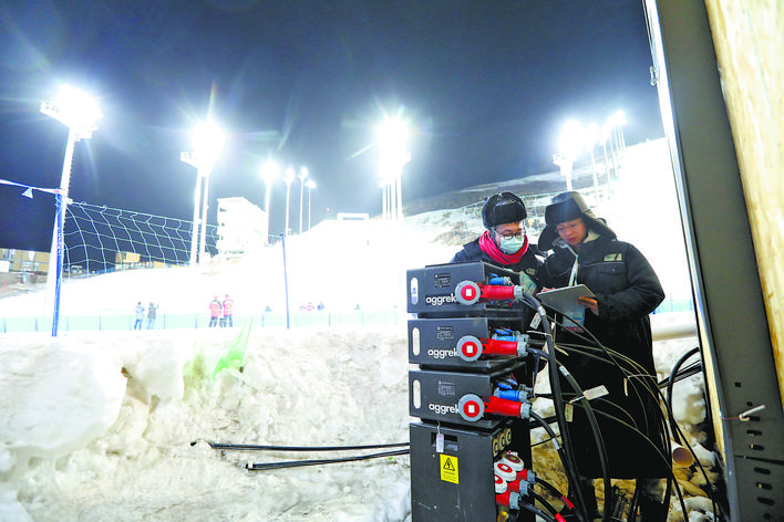 盡管有著嚴(yán)格的流程,供電保障團隊還要不時應(yīng)對各種突發(fā)情況。雪上競賽的一大特點是變化多——受氣溫、風(fēng)力等因素影響,測試活動時間隨時可能改變。原定于19時舉行的雪上技巧測試活動最終因大風(fēng)推遲,提前兩小時到位的值守人員原地等待,在活動結(jié)束后1小時確認保電任務(wù)完成,再從賽道撤離。
